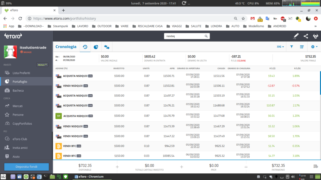 Dopo il weekend passato a guardare i lenti grafici BTC, oggi pomeriggio appena chiuse le vecchie transazioni mi sono fatto due ore e mazza del buon vecchio “microscalping” sul mercato NASDAQ.